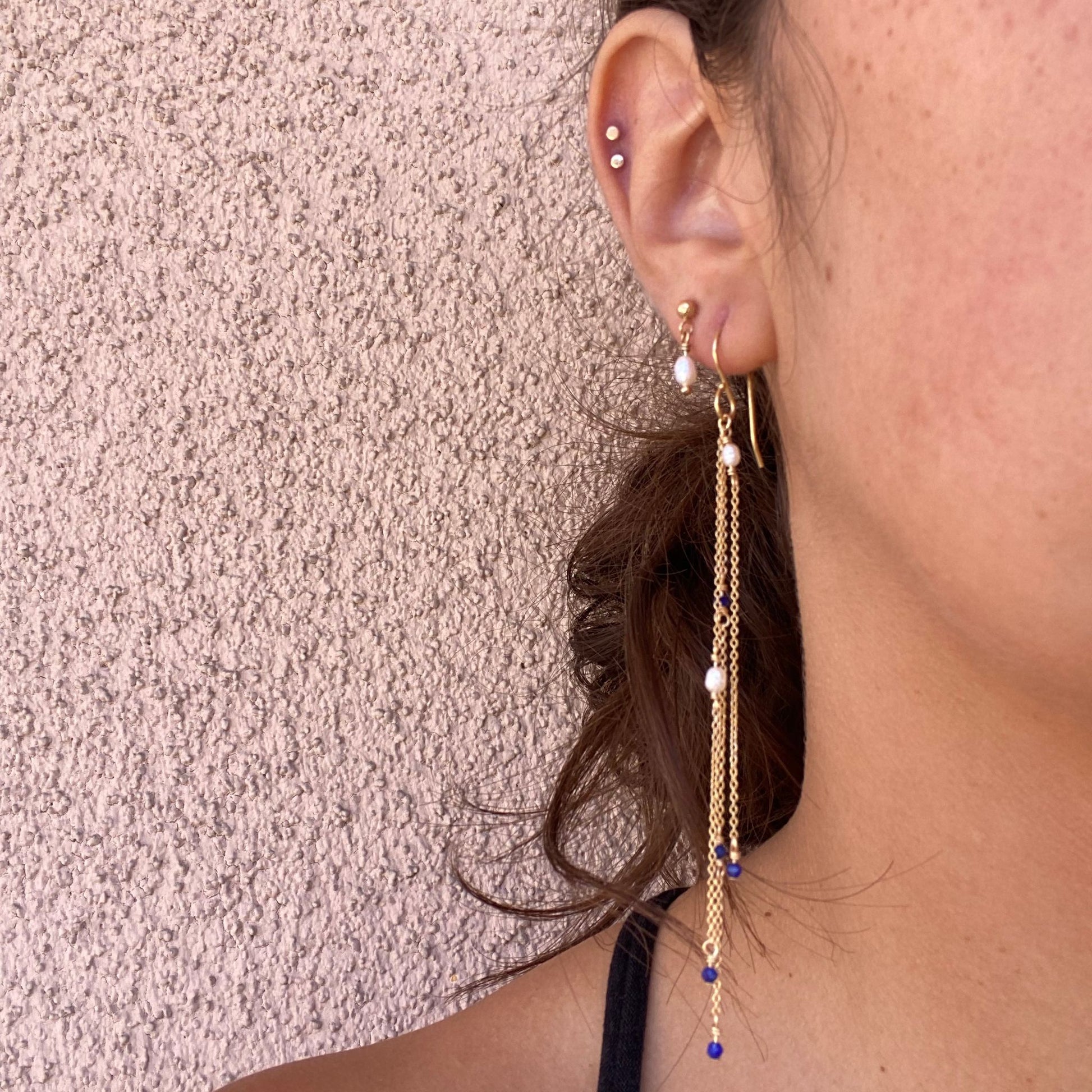 Inspired by lapis lazuli’s ancient connection to the heavens, the Skyfall Earrings pair luminous freshwater pearls with deep blue lapis lazuli. Three delicate chain strands cascade from each ear, interspersed with gems that bring a celestial elegance and fluid movement. Finished with French earwires, these earrings are a graceful statement for any occasion.